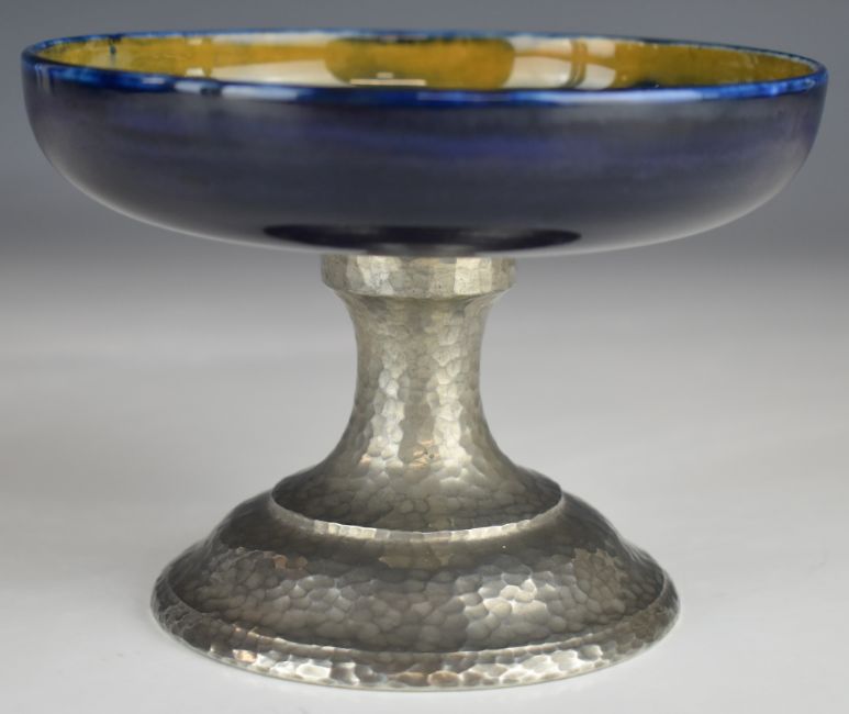 Moorcroft tazza decorated in the Pomegranate pattern, with pewter mount, H9.5cm, D13cm