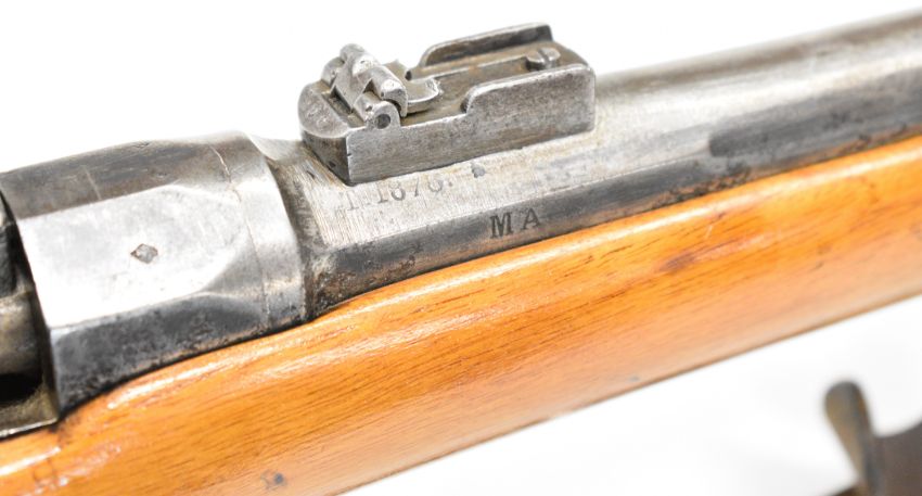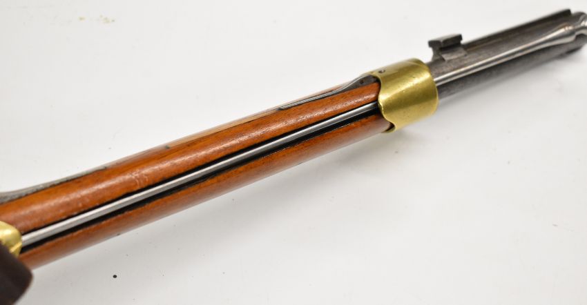 French 11mm Gras 1874 pattern bolt-action cavalry carbine with breech stamped 'Manufacture D Armes Tulle Mle 1874 M80', brass trigger guard, butt plate and barrel bands, embossed copper plaque inset to the stock, leather sling and 20 inch rifled barrel, overall length 97.5cm, serial number 88147.