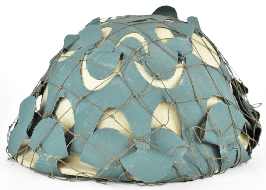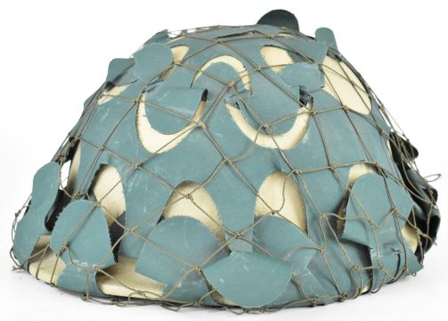 Two Iraqi helmets comprising M90 helmet with netting, Arabic text to front, rubber rim, liner and chinstrap, and a M80/03 helmet with foliage netting, liner and chinstrap.