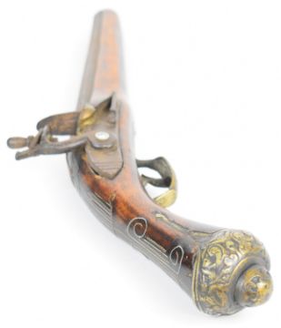 Eastern flintlock pistol with ornate brass trigger guard and butt cap, wire inlaid grip and 11.5 inch octagonal barrel, overall length 48.5cm.