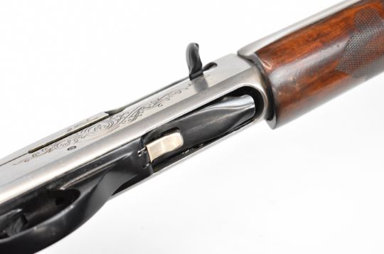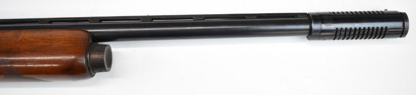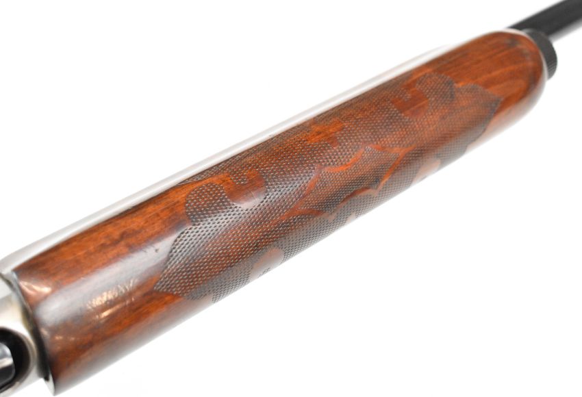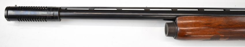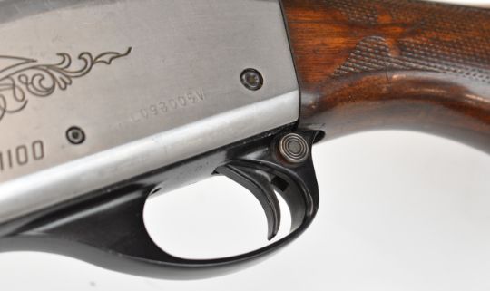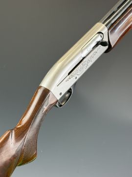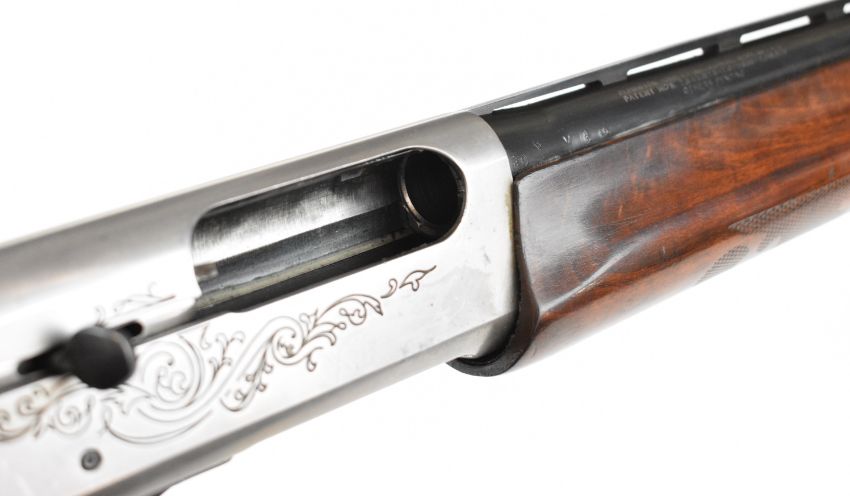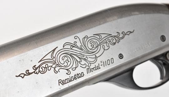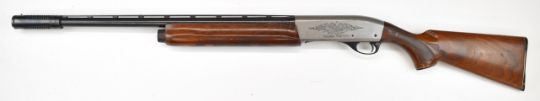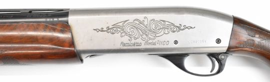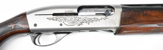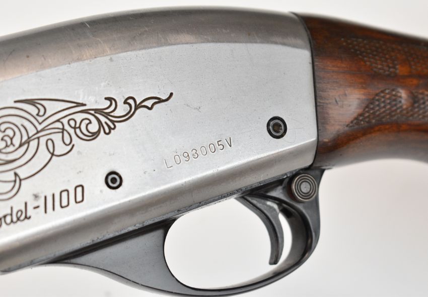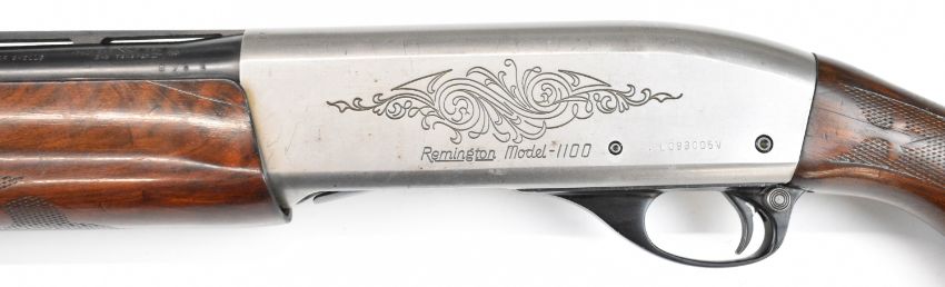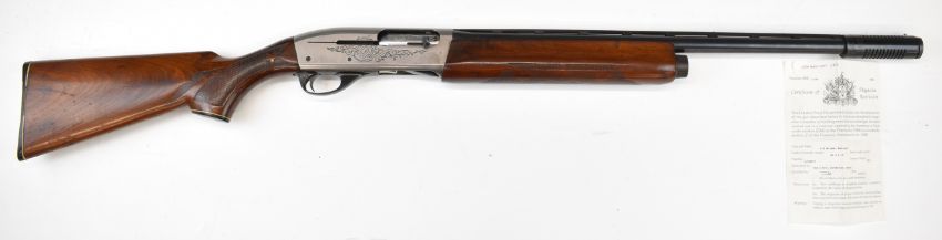 Remington Model 1100 12 bore 3-shot semi-automatic shotgun with ornately carved and chequered semi-pistol grip and forend, engraved action and bolt, vented rib, Lyman Cutts compensator and 24.5 inch barrel, overall length 116cm, length of pull 36cm, serial number L093005V, with certificate of magazine restriction. PLEASE NOTE THAT A VALID RELEVANT SHOTGUN CERTIFICATE IS REQUIRED TO VIEW OR PURCHASE THIS LOT AND FOR ALL SHOTGUNS OR RIFLES PLEASE ENSURE YOU HAVE THE RELEVANT CERTIFICATE BEFORE BIDDING.