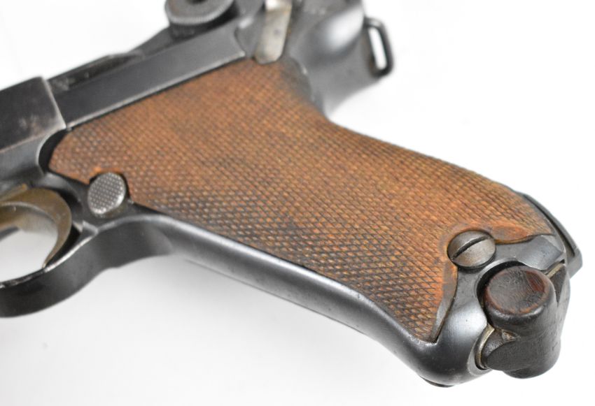 Deactivated German Luger semi-automatic pistol with chequered wooden grips, breech dated 1917, toggle and side plate stamped '34' and 4 inch barrel, overall length 25cm, serial number 9634, in original leather holster stamped 'Meier & Abitzsch Leipzig-Gohlis 1916', with spare magazines and de-activation certificate dated 08/09/25.