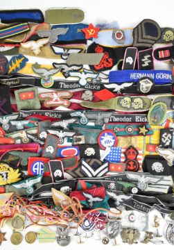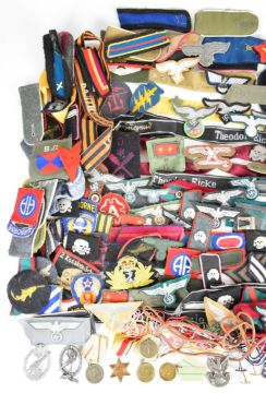 Large collection of mainly reproduction Nazi German / Soviet / Russian cloth insignia, badges and medals including Luftwaffe anti-air flak, Luftwaffe ground assault, panzer assualt badges, defence of Leningrad and Odessa, Partisan and 20 Years of the Red Army medals, together with a large quantity of insignia and arm patches including SS, Luftwaffe, etc