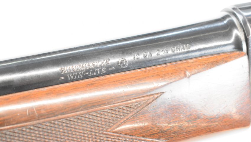 Winchester M59 Win-Lite 12 bore 3-shot semi-automatic shotgun with engraved scenes of dogs and birds to the action, chequered semi-pistol grip and forend and 26 inch multi-choke barrel, overall length 115.5cm, length of pull 35.5cm, serial number 46185. PLEASE NOTE THAT A VALID RELEVANT SHOTGUN CERTIFICATE IS REQUIRED TO VIEW OR PURCHASE THIS LOT AND FOR ALL SHOTGUNS OR RIFLES. PLEASE ENSURE YOU HAVE THE RELEVANT CERTIFICATE BEFORE BIDDING.