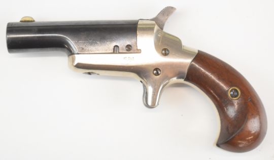 Colt Derringer .41 rimfire pocket pistol with sheath trigger, shaped wooden grips and named 2.5 inch rifled barrel, overall length 13.5cm.