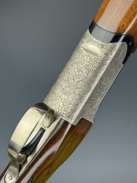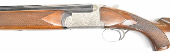 Barasingha 220 12 bore over and under ejector shotgun with engraved action, underside, top plate and thumb lever, chequered semi-pistol grip and forend, single trigger, vented top rib and 28 inch barrels choked ½ and full, overall length 114.5cm, length of pull 36.5cm, serial number 4165923. PLEASE NOTE THAT A VALID RELEVANT SHOTGUN CERTIFICATE IS REQUIRED TO VIEW OR PURCHASE THIS LOT AND FOR ALL SHOTGUNS OR RIFLES. PLEASE ENSURE YOU HAVE THE RELEVANT CERTIFICATE BEFORE BIDDING.