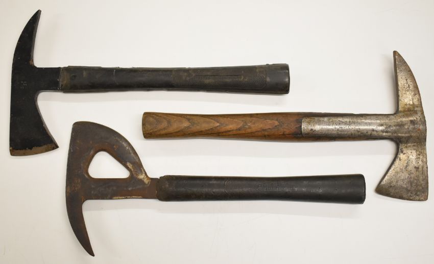Three military and similar escape axes comprising a Elwell example dated 1944, Gilpin example dated 1952 and a British Railways example. PLEASE NOTE: WE ARE NOT ABLE TO OFFER OUR USUAL POSTAGE SERVICE FOR THIS LOT