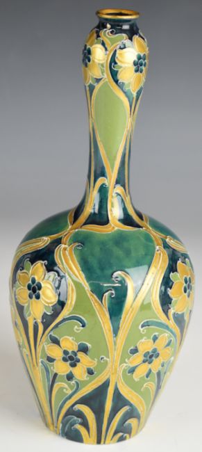 William Moorcroft Macintyre Florian Ware vase decorated in green and gold, with signed and printed marks and 'Albert E. Wade collection' Sotheby's 2002 collection label to base, H26cm  (Please note this a very similar vase to the previous lot in the sale and world make a near pair.)