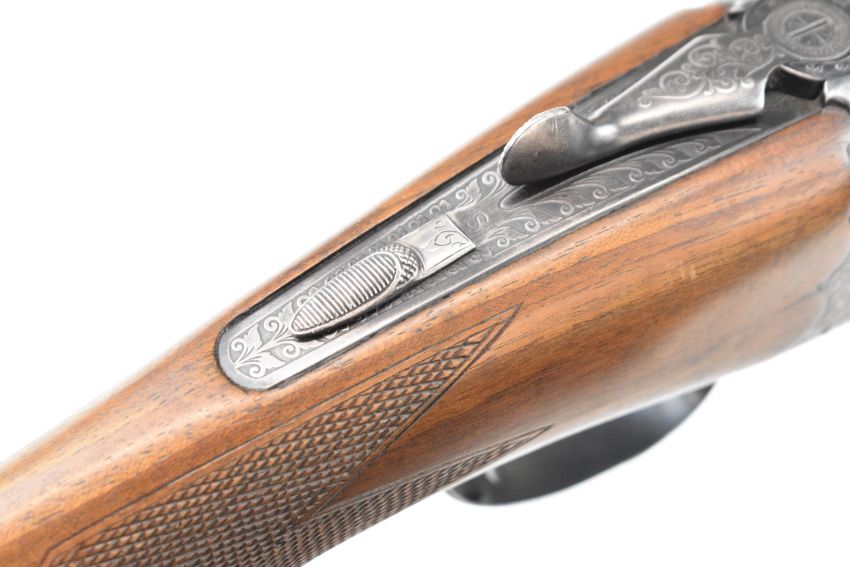 SKB 12 bore side by side ejector shotgun with engraved locks, underside, trigger guard, top plate, thumb lever and fences, chequered grip and forend, vacant cartouche to the underside of the stock, single trigger and named 28 inch barrels choked ½ and cylinder, overall length 113cm, length of pull 35.5cm, serial number 55212397. PLEASE NOTE THAT A VALID RELEVANT SHOTGUN CERTIFICATE IS REQUIRED TO VIEW OR PURCHASE THIS LOT AND FOR ALL SHOTGUNS OR RIFLES. PLEASE ENSURE YOU HAVE THE RELEVANT CERTIFICATE BEFORE BIDDING.