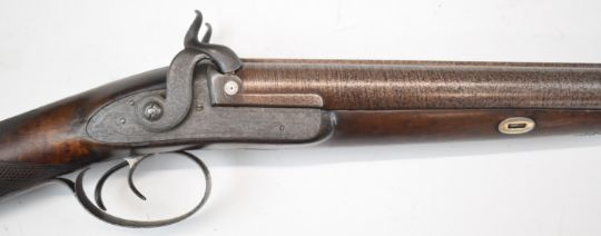 John Manton & Son 12 bore side by side percussion hammer action muzzle loading shotgun with engraved locks featuring dog and bird scenes and named 'John Manton & Son Patent', engraved hammers, trigger guard and top plate, chequered grip, leather cheek piece, brass tipped wooden ram-rod, vacant wrist cartouche and named 32 inch Damascus barrels, overall length 121.5cm, serial number 11019.