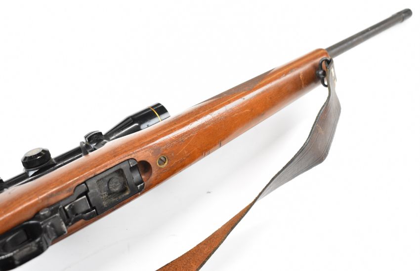 Ruger Model 10/22 .22 semi-automatic rifle with chequered semi-pistol grip and forend, multi-shot magazine, leather sling, Nikko Stirling Silver Crown 4x32 scope and 19 inch barrel, overall length 94cm, serial number 116-18256. PLEASE NOTE THAT A VALID RELEVANT FIREARMS CERTIFICATE IS REQUIRED TO VIEW OR PURCHASE THIS LOT AND FOR ALL SHOTGUNS OR RIFLES. PLEASE ENSURE YOU HAVE THE RELEVANT CERTIFICATE BEFORE BIDDING.