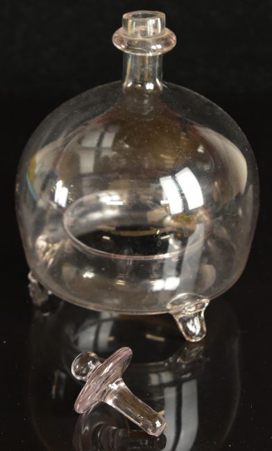 Georgian hand blown glass wasp trap raised on three feet and with removable lid, 20cm tall.