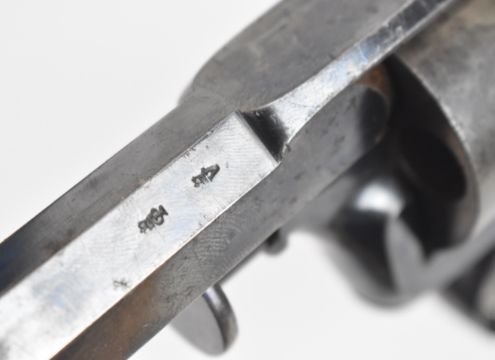 Deane, Adams & Deane Adam's patent 38 bore 5-shot self-cocking revolver with chequered wooden grips, storage compartment to the butt cap, named top plate and 7.5 inch rifled octagonal barrel, overall length 36cm, in fitted oak box with 'Deane, Adams, & Deane, Gun Makers To HRH Prince Albert 30 King William Street London Bridge' label, bullet mould stamped 'Registered R Adams 28 Nov 1851', G&JW Hawksley copper and brass powder flask, oil bottle etc.