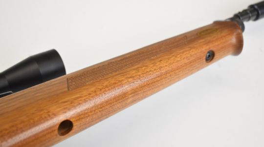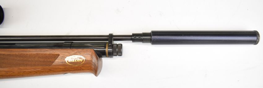 Falcon .22 bolt-action PCP air rifle with chequered semi-pistol grip and forend, raised cheek piece, adjustable trigger, two 8-shot magazines, sound moderator and Nikko Stirling Mountmaster 4x32 scope, serial number 70663. IF YOU REQUIRE POSTAGE THEN PLEASE NOTE THAT ALL POST-1939 AIR WEAPONS CAN ONLY BE SENT TO A REGISTERED FIREARMS DEALER AND NOT TO A HOME ADDRESS