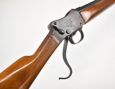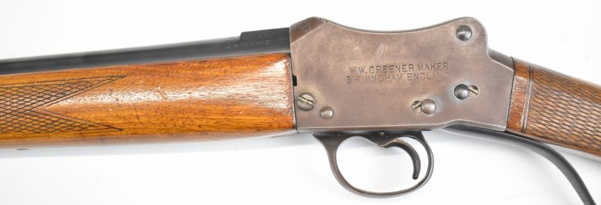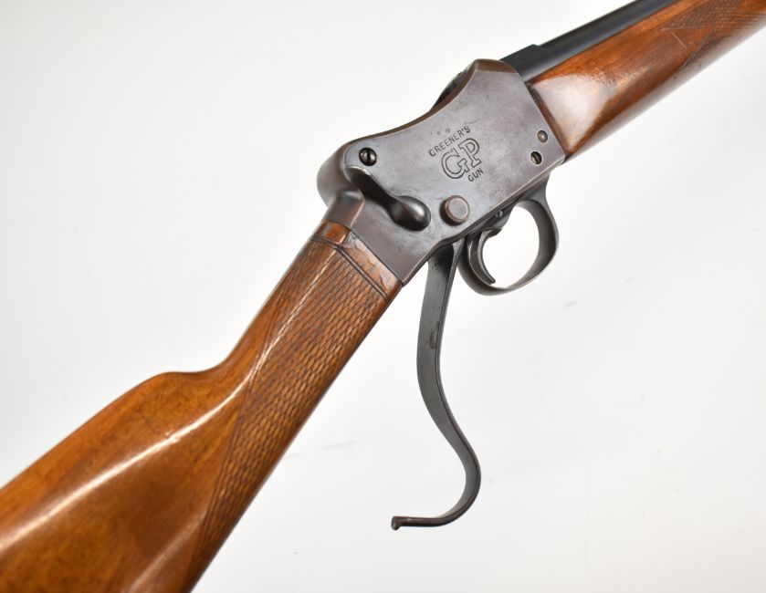W W Greener Greener's GP Gun Martini underlever action 12 bore single barrelled shotgun with named lock, chequered grip and forend and 30 inch barrel choked ½, overall length 117.5cm, length of pull 36.5cm, serial number 51989. PLEASE NOTE THAT A VALID RELEVANT SHOTGUN CERTIFICATE IS REQUIRED TO VIEW OR PURCHASE THIS LOT AND FOR ALL SHOTGUNS OR RIFLES. PLEASE ENSURE YOU HAVE THE RELEVANT CERTIFICATE BEFORE BIDDING.