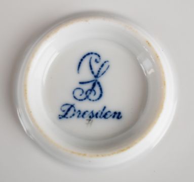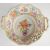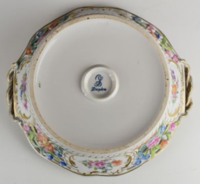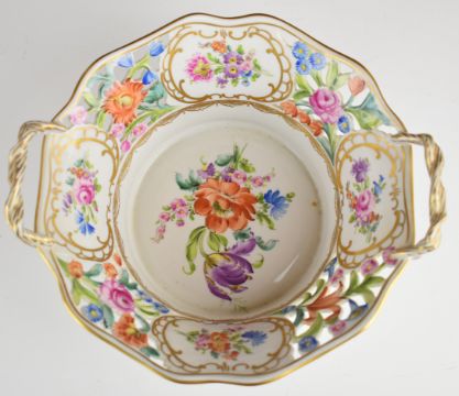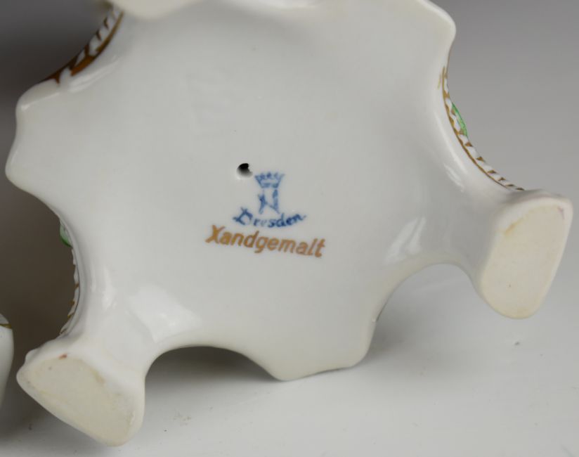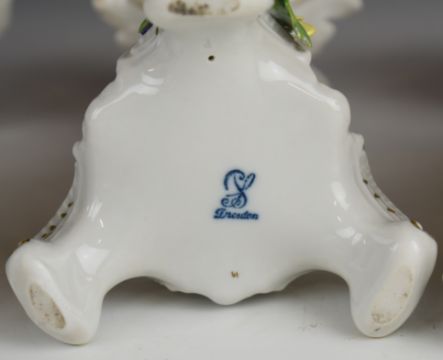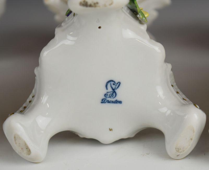 Four Dresden porcelain flower encrusted candlesticks, twin handled basket and an unmarked bird group, tallest 19cm
