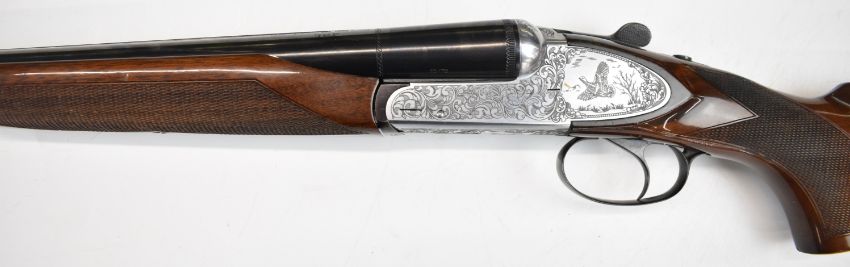 Fausti 12 bore side by side ejector shotgun with engraved scenes of birds and dogs amongst scrolling decoration to the sidelock plates, underside, trigger guard, top plate, thumb lever and fences, chequered semi-pistol grip and forend, single trigger and named 28 inch multi-choke barrels, overall length 114.5cm, length of pull 36.5cm, serial number B45320, with three additional chokes and choke key. PLEASE NOTE THAT A VALID RELEVANT SHOTGUN CERTIFICATE IS REQUIRED TO VIEW OR PURCHASE THIS LOT AND FOR ALL SHOTGUNS OR RIFLES. PLEASE ENSURE YOU HAVE THE RELEVANT CERTIFICATE BEFORE BIDDING.