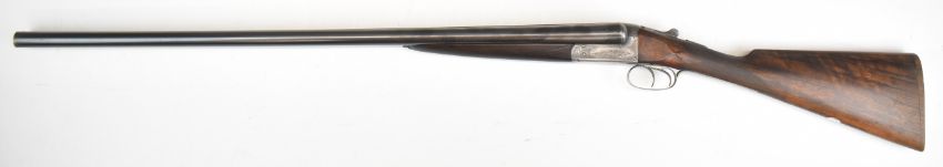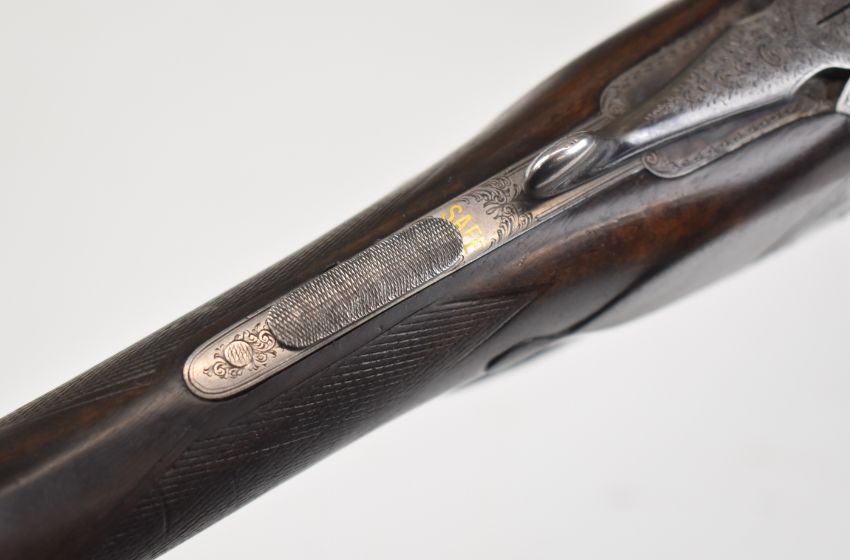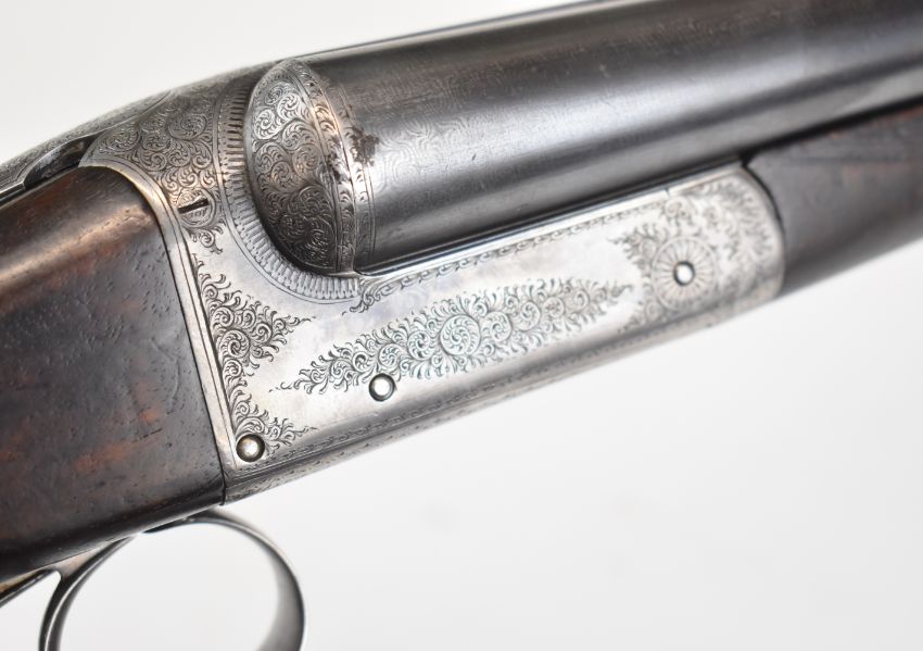 Mortimer & Son 12 bore side by side ejector shotgun with engraved locks, trigger guard, underside, top plate, thumb lever and fences, chequered grip and forend, carved teardrop to the wrist, vacant cartouche to the underside of the stock, double trigger and named 30 inch Damascus barrels choked ¾ and improved cylinder, overall length 118.5cm, length of pull 37.5cm, serial number 7349. PLEASE NOTE THAT A VALID RELEVANT SHOTGUN CERTIFICATE IS REQUIRED TO VIEW OR PURCHASE THIS LOT AND FOR ALL SHOTGUNS OR RIFLES. PLEASE ENSURE YOU HAVE THE RELEVANT CERTIFICATE BEFORE BIDDING.