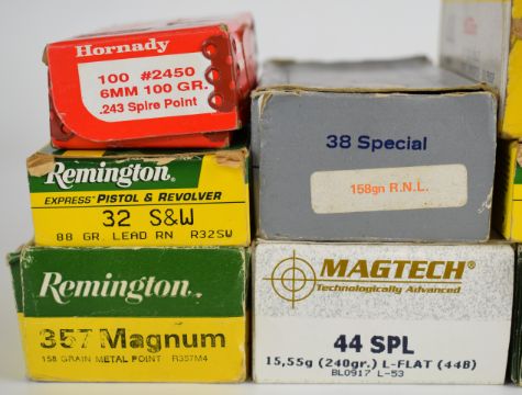 A collection of pistol/ revolver/ rifle cartridges including .38 Special, .44 Magnum, .357 Magnum, .32 S&W, .45 ACP, .44 Special and .357, most in original boxes.  PLEASE NOTE THAT A VALID RELEVANT RFD CERTIFICATE IS REQUIRED TO VIEW OR PURCHASE THIS LOT AND FOR ALL SHOTGUNS, RIFLES OR AMMUNITION PLEASE ENSURE YOU HAVE THE RELEVANT CERTIFICATE BEFORE BIDDING. PLEASE ALSO NOTE THAT AMMUNITION CANNOT BE SENT IN THE POST.