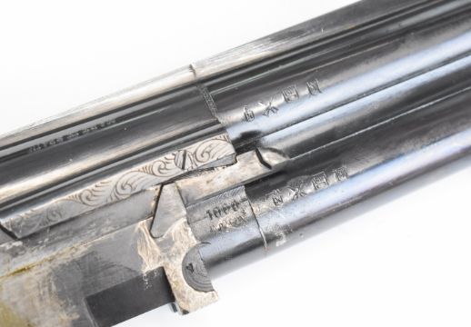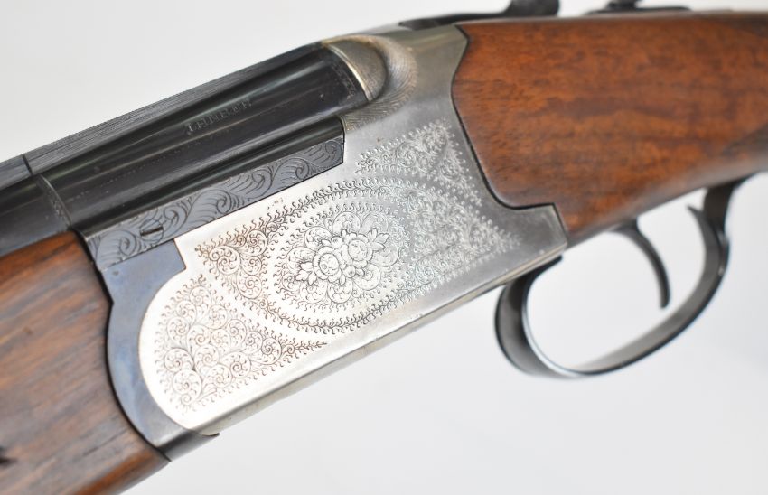 Lanber 12 bore over and under ejector shotgun with engraved locks, underside, trigger guard, top plate and thumb lever, chequered semi-pistol grip and forend, single trigger, vented top and central ribs and 27.5 inch barrels choked ½ and improved cylinder, overall length 112.5cm, length of pull 36cm, serial number 159559. PLEASE NOTE THAT A VALID RELEVANT SHOTGUN CERTIFICATE IS REQUIRED TO VIEW OR PURCHASE THIS LOT AND FOR ALL SHOTGUNS OR RIFLES. PLEASE ENSURE YOU HAVE THE RELEVANT CERTIFICATE BEFORE BIDDING.