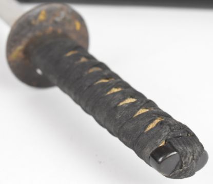 Japanese Wakizashi Samurai sword with bound shagreen grip, gilt and embossed tsuba decorated with an emaciated man, engraved fuchi, ornate manuki and 35cm blade, in lacquer scabbard with signed kozuka knife decorated with figures to the handle. PLEASE NOTE: WE ARE NOT ABLE TO OFFER OUR USUAL POSTAGE SERVICE FOR THIS LOT