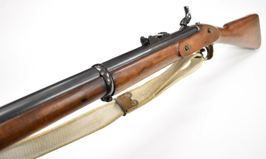 Enfield pattern three band percussion hammer action rifle with brass trigger guard, butt plate and mounts, adjustable ladder sights, steel ram-rod, canvas sling and 39 inch rifled barrel, overall length 140cm.