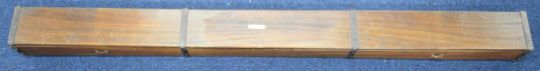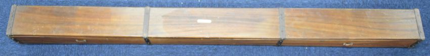 Hardy Brothers vintage metal bound mahogany fishing rod travelling case with hinged lid, length 194cm