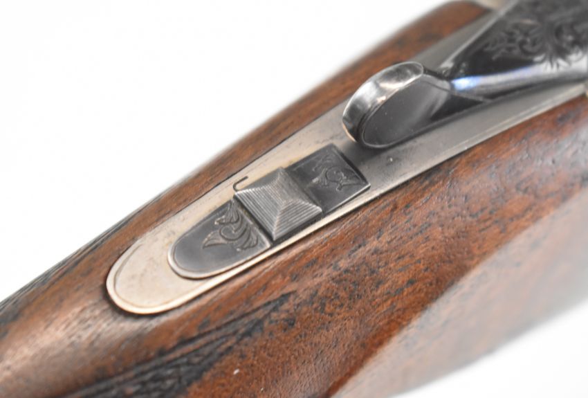 Miroku 12 bore over and under ejector shotgun with engraved lock, underside, trigger guard and thumb lever, chequered semi-pistol grip and forend, carved teardrop to the wrist, single trigger, vented top rib and 26 inch barrels choked improved cylinder, overall length 111cm, length of pull 38.5cm, serial number 80298 PZ. PLEASE NOTE THAT A VALID RELEVANT SHOTGUN CERTIFICATE IS REQUIRED TO VIEW OR PURCHASE THIS LOT AND FOR ALL SHOTGUNS OR RIFLES PLEASE ENSURE YOU HAVE THE RELEVANT CERTIFICATE BEFORE BIDDING.