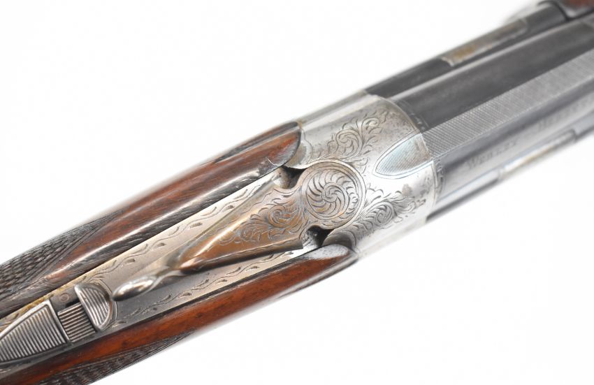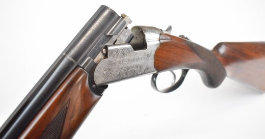 Webley Beretta 12 bore over and under ejector shotgun with named and engraved locks, engraved underside, trigger guard, top plate and thumb lever, chequered semi-pistol grip and forend, vacant cartouche to the underside of the stock, single trigger, vented top rib and 28 inch barrels choked ¼ and ½, overall length 114.5cm, length of pull 36cm, serial number 300034/ P43732. PLEASE NOTE THAT A VALID RELEVANT SHOTGUN CERTIFICATE IS REQUIRED TO VIEW OR PURCHASE THIS LOT AND FOR ALL SHOTGUNS OR RIFLES. PLEASE ENSURE YOU HAVE THE RELEVANT CERTIFICATE BEFORE BIDDING.