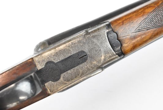Arizaga 12 bore side by side sidelock ejector shotgun with engraved locks, underside, top plate, thumb lever and fences, chequered grip and forend, double trigger and named 27.5 inch barrels choked ¾ and full, overall length 113cm, length of pull 36.5cm, serial number FA123066. PLEASE NOTE THAT A VALID RELEVANT SHOTGUN CERTIFICATE IS REQUIRED TO VIEW OR PURCHASE THIS LOT AND FOR ALL SHOTGUNS OR RIFLES. PLEASE ENSURE YOU HAVE THE RELEVANT CERTIFICATE BEFORE BIDDING.