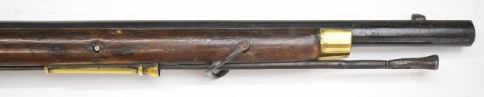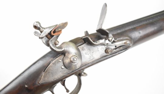 East India Company Brown Bess flintlock musket with lion stamped to the lock, brass trigger guard and butt plate, steel ram-rod, sling mounts and 39 inch smooth bored barrel, overall length 138.5cm.