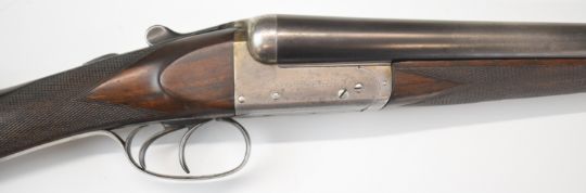 Webley & Scott 12 bore side by side ejector shotgun with named locks, chequered grip and forend, vacant cartouche to the underside of the stock, double trigger and named 30 inch barrels choked ¼ and cylinder, overall length 119.5cm, length of pull 37.5cm, serial number 89582. PLEASE NOTE THAT A VALID RELEVANT SHOTGUN CERTIFICATE IS REQUIRED TO VIEW OR PURCHASE THIS LOT AND FOR ALL SHOTGUNS OR RIFLES. PLEASE ENSURE YOU HAVE THE RELEVANT CERTIFICATE BEFORE BIDDING.