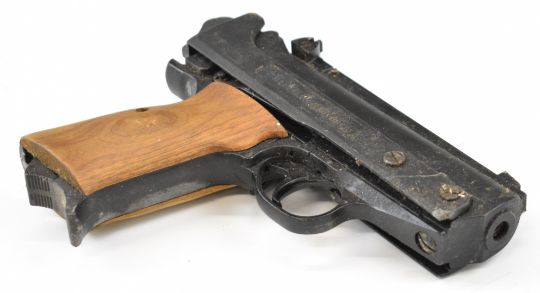 FB Record Jumbo .177 air pistol with shaped wooden grips and adjustable sights, NVSN. IF YOU REQUIRE POSTAGE THEN PLEASE NOTE THAT ALL POST-1939 AIR WEAPONS CAN ONLY BE SENT TO A REGISTERED FIREARMS DEALER AND NOT TO A HOME ADDRESS