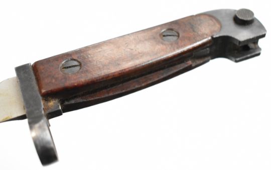 Cuban AK47 bayonet with wooden grips, 0062 to crossguard, 16.5cm Bowie style blade, scabbard, belt loop and securing strap. PLEASE NOTE: WE ARE NOT ABLE TO OFFER OUR USUAL POSTAGE SERVICE FOR THIS LOT