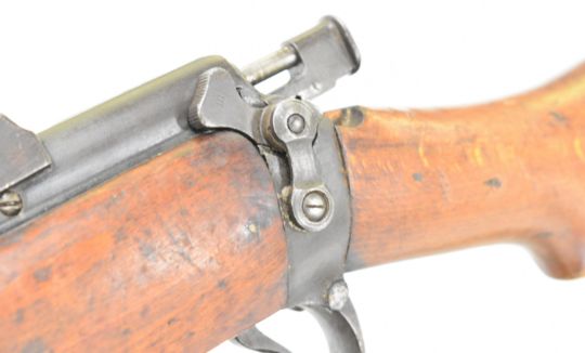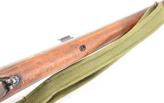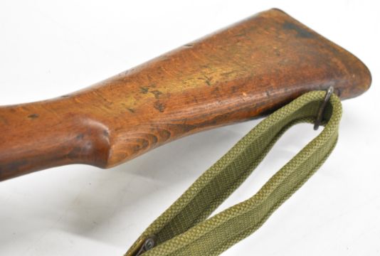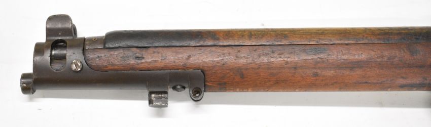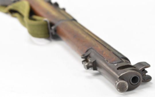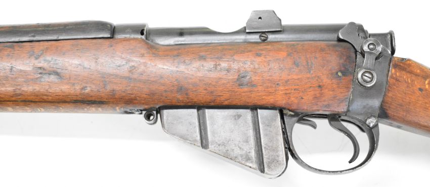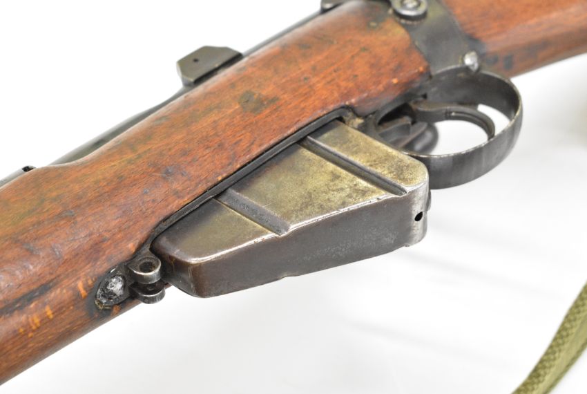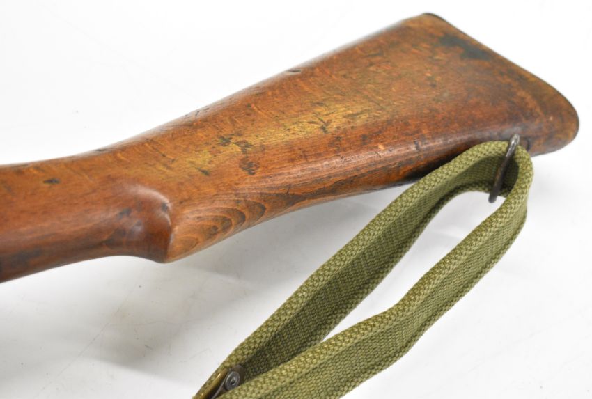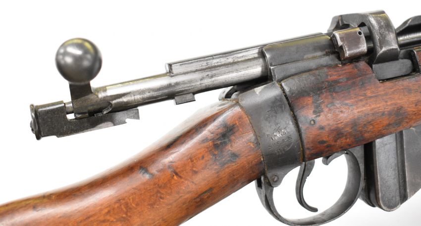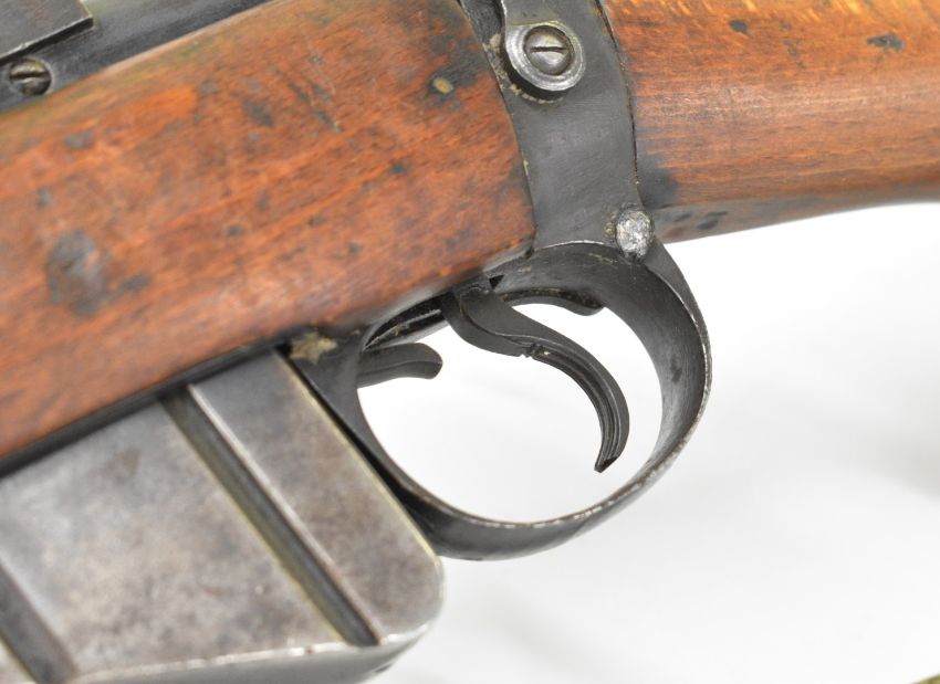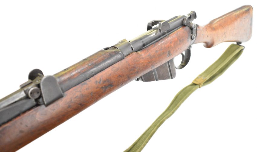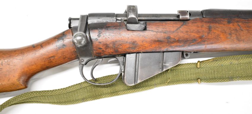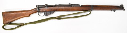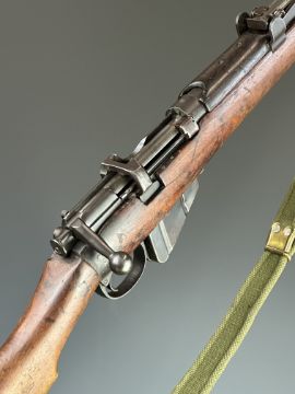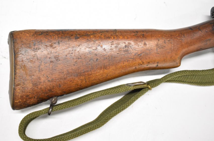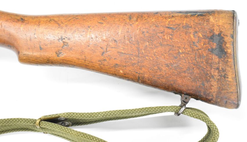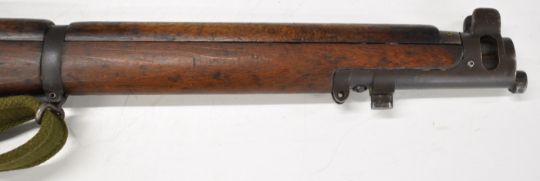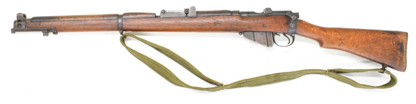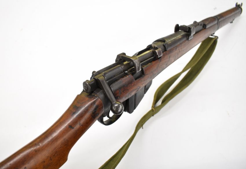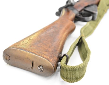 Lee-Enfield No 1 Mk III* .410 shotgun converted from a .303 bolt-action service rifle with adjustable sights, storage compartment to the brass butt plate, frame stamped 'GR B 1918 Sht Lee No.1 Mk.III*' below crown, canvas sling and 25.5 inch barrel, overall length 111cm, serial number N36451. PLEASE NOTE THAT A VALID RELEVANT SHOTGUN CERTIFICATE IS REQUIRED TO VIEW OR PURCHASE THIS LOT AND FOR ALL SHOTGUNS OR RIFLES PLEASE ENSURE YOU HAVE THE RELEVANT CERTIFICATE BEFORE BIDDING.