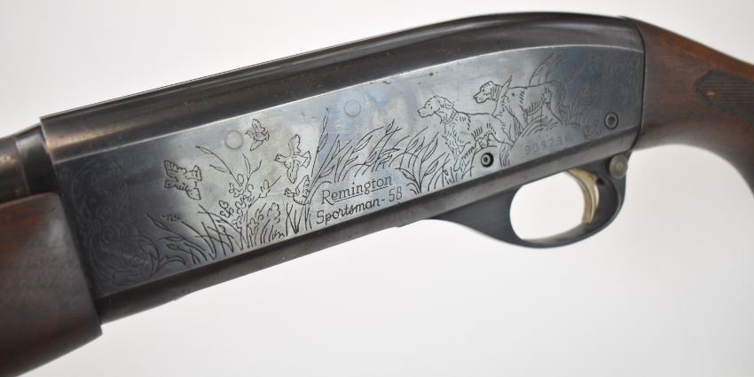 Remington Sportsman 58 16 bore 3-shot semi-automatic shotgun with engraved scenes of dogs and birds to the action, chequered semi-pistol grip and forend and 28 inch barrel, overall length 124cm, length of pull 36.5cm, serial number 93579W. PLEASE NOTE THAT A VALID RELEVANT FIREARMS CERTIFICATE IS REQUIRED TO VIEW OR PURCHASE THIS LOT AND FOR ALL SHOTGUNS OR RIFLES. PLEASE ENSURE YOU HAVE THE RELEVANT CERTIFICATE BEFORE BIDDING.