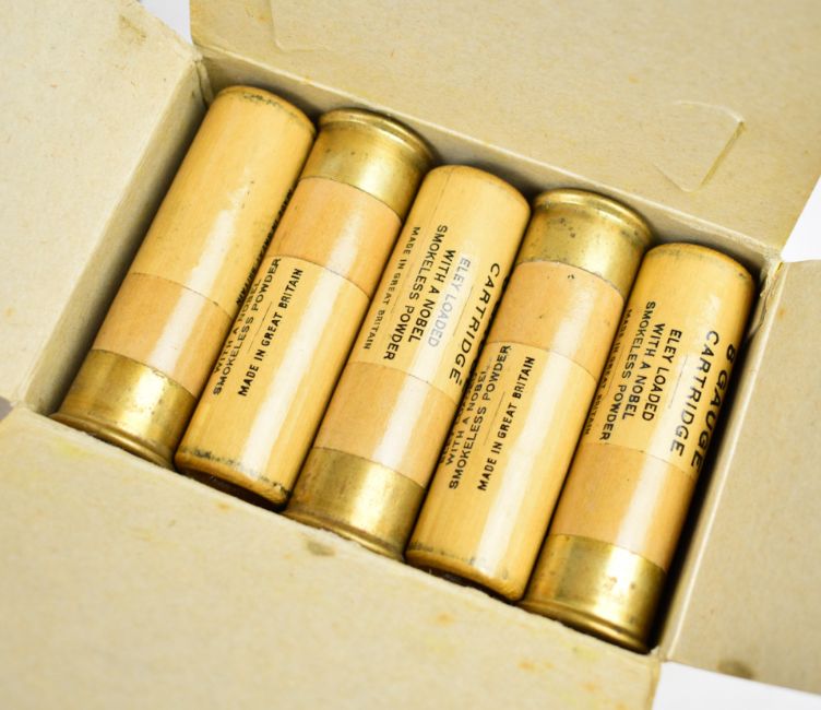 One hundred and four 8 bore shotgun cartridges including Eley Gastight, some in original boxes. PLEASE NOTE THAT A VALID RELEVANT SHOTGUN CERTIFICATE IS REQUIRED TO VIEW OR PURCHASE THIS LOT AND FOR ALL SHOTGUNS, RIFLES OR AMMUNITION PLEASE ENSURE YOU HAVE THE RELEVANT CERTIFICATE BEFORE BIDDING. PLEASE ALSO NOTE THAT AMMUNITION CANNOT BE SENT IN THE POST.