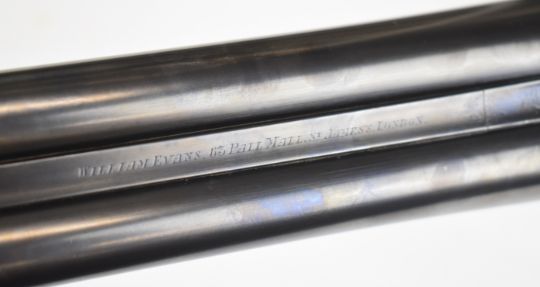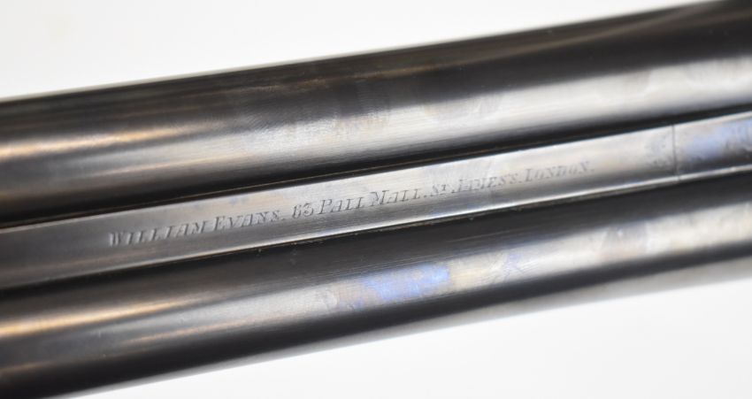 William Evans 12 bore side by side ejector shotgun with named and engraved locks, scrolling engraving to the underside, trigger guard, top plate, thumb lever and fences, chequered grip and forend, carved teardrop to the wrist, vacant cartouche to the underside of the stock, double trigger and named 30 inch barrels choked ¼, overall length 120.5cm, length of pull 39cm, serial number 12007. PLEASE NOTE THAT A VALID RELEVANT SHOTGUN CERTIFICATE IS REQUIRED TO VIEW OR PURCHASE THIS LOT AND FOR ALL SHOTGUNS OR RIFLES PLEASE ENSURE YOU HAVE THE RELEVANT CERTIFICATE BEFORE BIDDING.