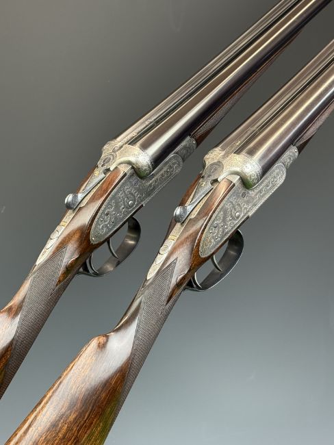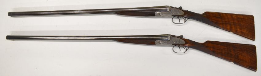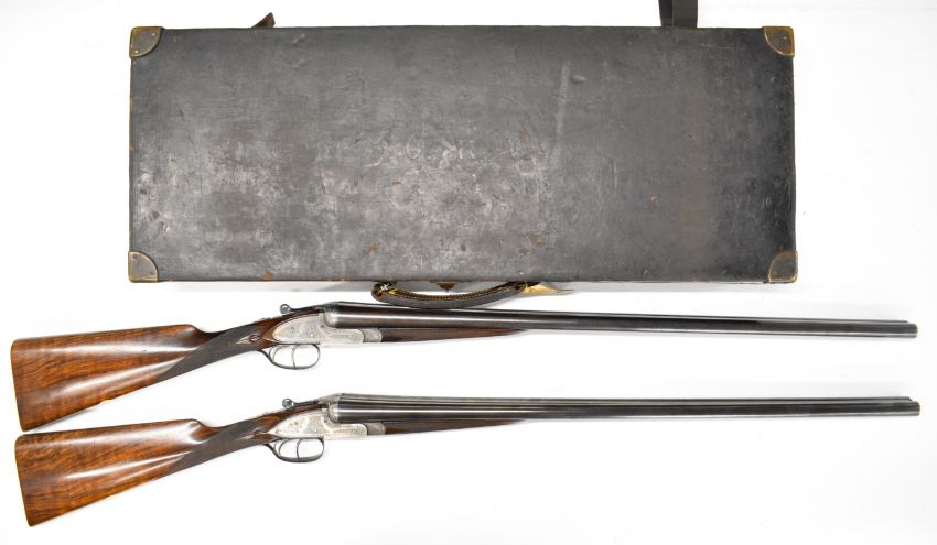 Pair of William Evans 12 bore sidelock side by side ejector shotguns each with named and engraved locks, all over scrolling and floral engraving, chequered grip and forend, carved teardrop to the wrist, vacant cartouche to the underside of the stock, double trigger and named 30 inch barrels, numbered 1 and 2 in gold to the thumb lever, forend and barrels, overall length 120cm, length of pull 37.5cm, serial numbers 14264 and 14265, in original leather and brass bound fitted carry case with oil bottle, snapcaps, accessories and 'William Evans Gun & Rifle Makers 63 Pall Mall St James's Lonson SW Gunmakers to HRH Duke of Connaught, K.G.' label. PLEASE NOTE THAT A VALID RELEVANT SHOTGUN CERTIFICATE IS REQUIRED TO VIEW OR PURCHASE THIS LOT AND FOR ALL SHOTGUNS OR RIFLES PLEASE ENSURE YOU HAVE THE RELEVANT CERTIFICATE BEFORE BIDDING.