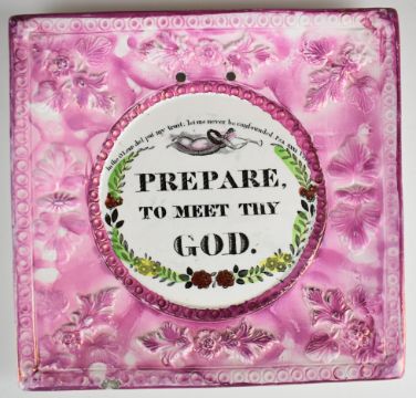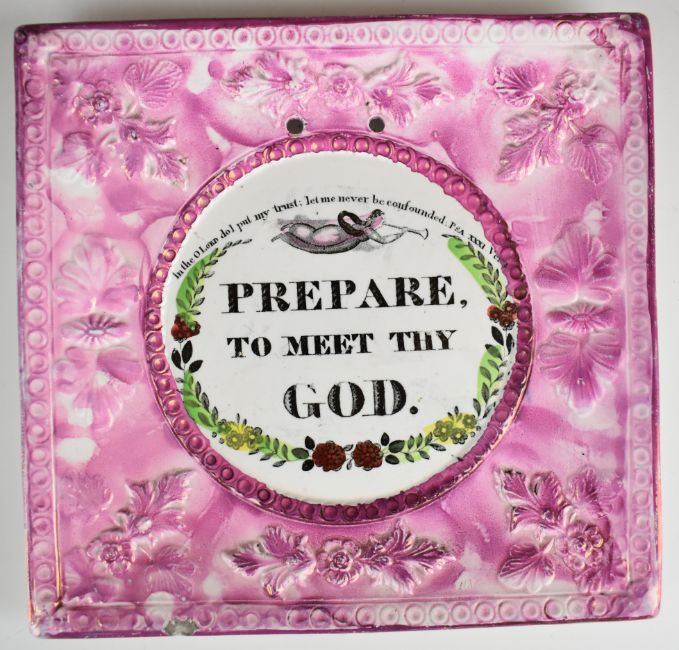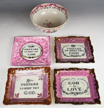 Four Sunderland lustre plaques, Wesleyan / Methodist interest and a 19thC Chinese famille rose pedestal bowl, largest plaque 20.5 x 20.5cm, diameter of bowl 23cm