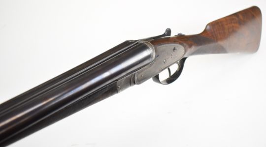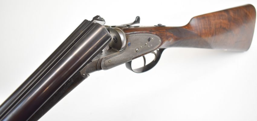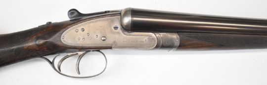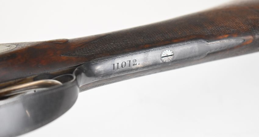 Pair of William Evans 12 bore sidelock side by side ejector shotguns each with named and border  engraved locks, chequered grip and forend, carved teardrop to the wrist, vacant gold cartouche to the underside of the stock, double trigger and named 28 inch barrels choked improved cylinder, numbered 1 and 2 in gold to the thumb lever, forend and barrels, overall length 114cm, length of pull 37cm, serial numbers 11012 and 11013, in original leather and brass bound fitted carry case with 'William Evans Gun & Rifle Manufacturer Late with J Purdey & Sons, 63 Pall Mall Lonson' label. PLEASE NOTE THAT A VALID RELEVANT SHOTGUN CERTIFICATE IS REQUIRED TO VIEW OR PURCHASE THIS LOT AND FOR ALL SHOTGUNS OR RIFLES PLEASE ENSURE YOU HAVE THE RELEVANT CERTIFICATE BEFORE BIDDING.