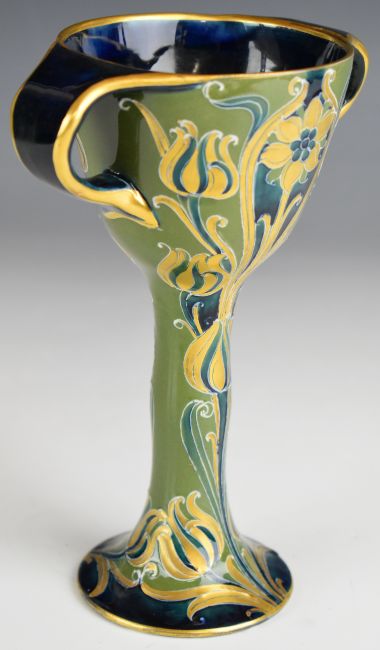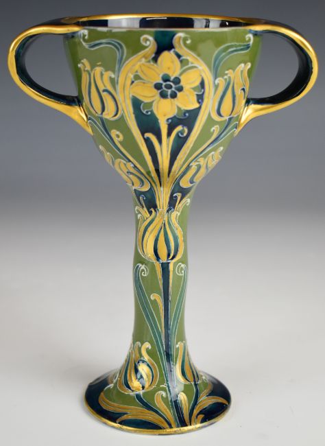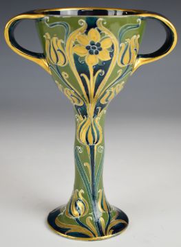 William Moorcroft Macintyre Florian Ware twin-handled chalice decorated in the Dahlia and Tulip pattern, with 'Albert E. Wade collection' Sotheby's 2002 paper label, signature and printed marks to base, H19cm