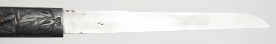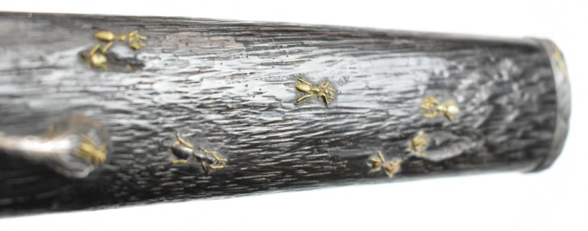 Japanese Tanto with Kogatana with engraved Japanese script to the silver Kozuka, the main handle and scabbard with gilt Shibayama style insects including grasshopper, bee and beetles, overall length 37cm, from the collection of John William Derrick (1881-1952). PLEASE NOTE: WE ARE NOT ABLE TO OFFER OUR USUAL POSTAGE SERVICE FOR THIS LOT