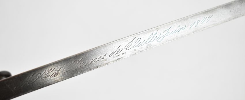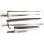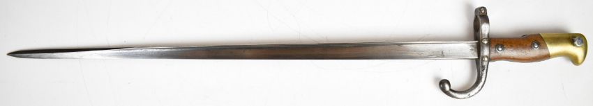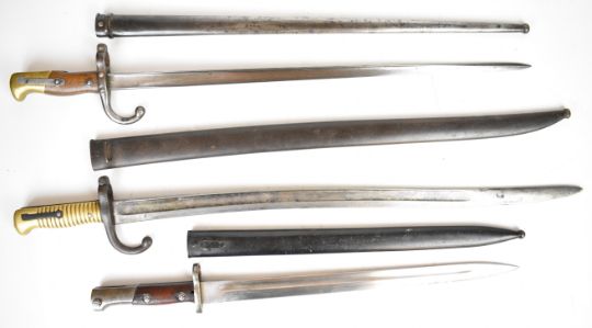 Three French / Belgian bayonets comprising French Gris bayonet, 52cm blade stamped 1877 to back of blade with matching numbered metal scabbard, French Chassepot bayonet, 57cm blade stamped 1872 to back of blade with matching numbered metal scabbard, German / Belgian Mauser bayonet, 38cm blade, stamped 267 to pommel in metal scabbard. PLEASE NOTE: WE ARE NOT ABLE TO OFFER OUR USUAL POSTAGE SERVICE FOR THIS LOT