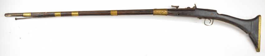 Eastern flintlock gun with brass barrel bands and butt plate, metal ram-rod and 39 inch barrel, overall length 134cm.