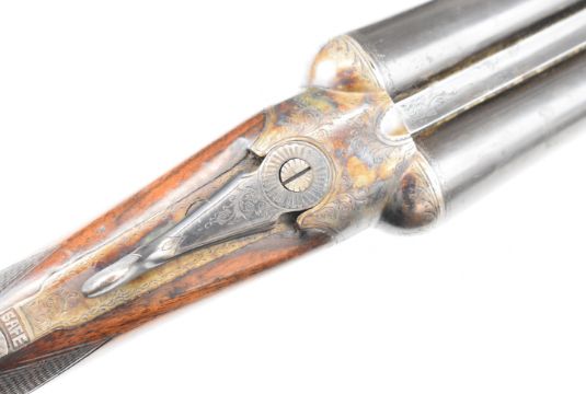 Midland Gun Co 12 bore side by side shotgun with engraved locks, underside, trigger guard, top plate, thumb lever and fences, chequered grip and forend, carved horn butt plate, double trigger and named 30 inch barrels choked ¼ and ¾, overall length 118.5cm, length of pull 37cm, serial number 25923. PLEASE NOTE THAT A VALID RELEVANT SHOTGUN CERTIFICATE IS REQUIRED TO VIEW OR PURCHASE THIS LOT AND FOR ALL SHOTGUNS OR RIFLES. PLEASE ENSURE YOU HAVE THE RELEVANT CERTIFICATE BEFORE BIDDING.