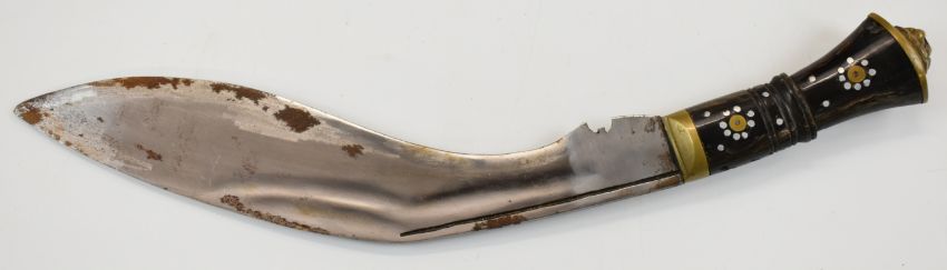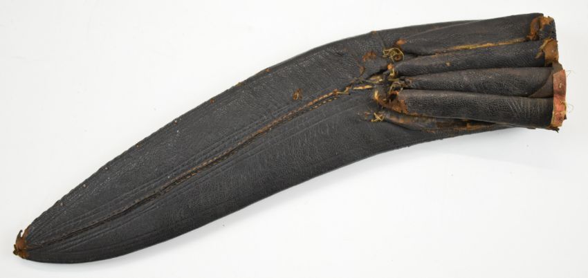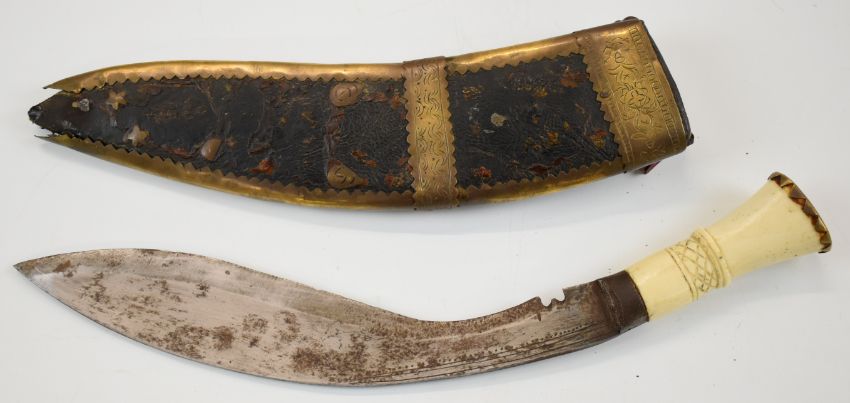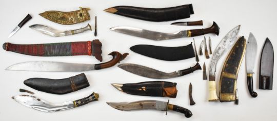 Five various Kukri knives to include a carved bone handled example and another with aluminium handle, blade marked India and scabbard with beadwork decoration, together with three further similar knives, overall length of longest 63cm. PLEASE NOTE: WE ARE NOT ABLE TO OFFER OUR USUAL POSTAGE SERVICE FOR THIS LOT