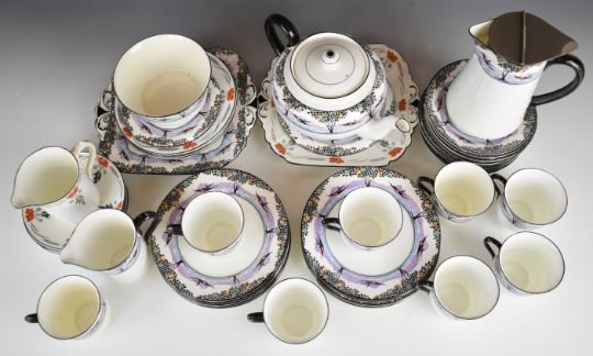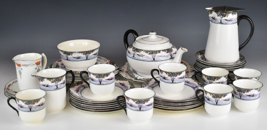 An extensive Shelley tea set decorated in the Swallows pattern including two cake plates, teapot with stand etc, approximately forty pieces and twelve pieces of Poppy pattern tea ware, tallest 23cm