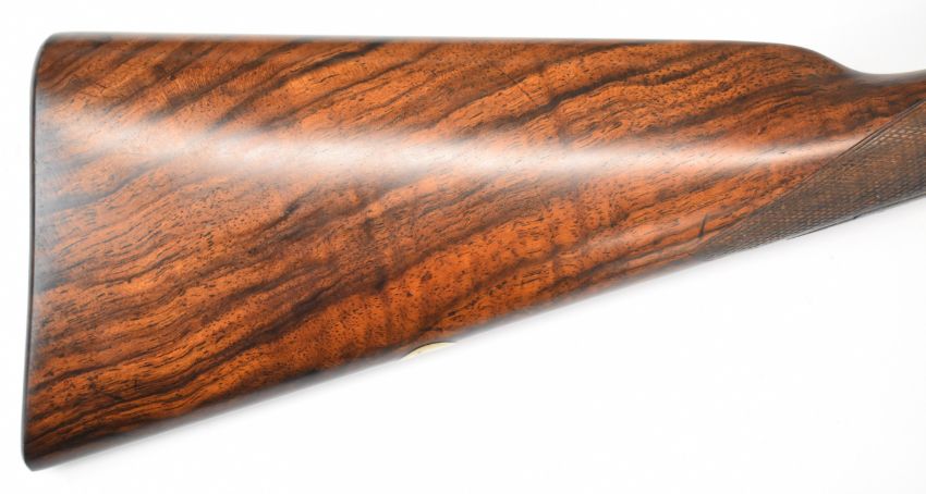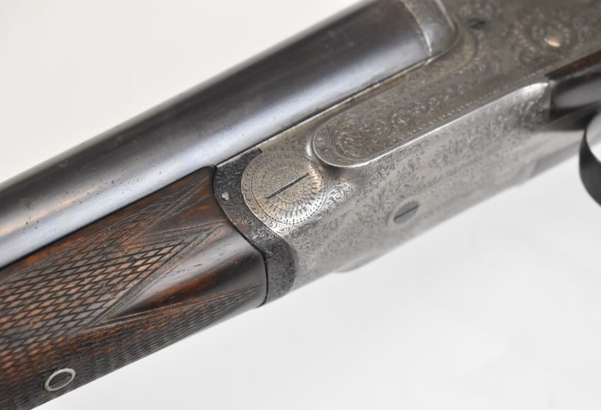 E Wilson 12 bore sidelock side by side ejector shotgun with scroll engraving to the named locks, underside, trigger guard, top plate, thumb lever and fences, chequered grip and forend, carved teardrop to the wrist, vacant cartouche to the underside of the stock, double trigger and named 29 inch barrels choked improved cylinder and ¾ and engraved 'C.S. Rosson & Co 13 Rampant Horse Street Norwich', overall length 116.5cm, length of pull 36.5cm, serial number 1397. PLEASE NOTE THAT A VALID RELEVANT SHOTGUN CERTIFICATE IS REQUIRED TO VIEW OR PURCHASE THIS LOT AND FOR ALL SHOTGUNS OR RIFLES PLEASE ENSURE YOU HAVE THE RELEVANT CERTIFICATE BEFORE BIDDING.
