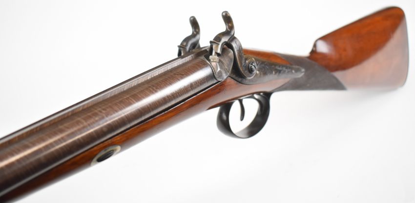 Charles Playfair 16 bore side by side muzzle loading percussion hammer action shotgun with named and engraved locks, engraved stylised dolphin hammers, trigger guard and top strap, chequered grip and forend, brass tipped wooden ramrod, double trigger and 31 inch Damascus barrels, overall length 119cm, together with embossed brass powder flask, shot flask, percussion cap dispenser, wads etc